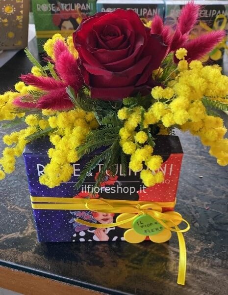 Se desideri sorprendere una persona speciale, la flowerbox con mimose e rosa rossa è la scelta ideale.